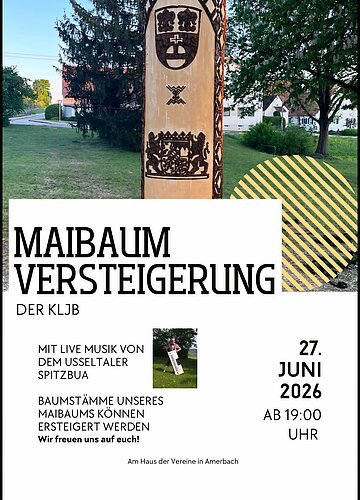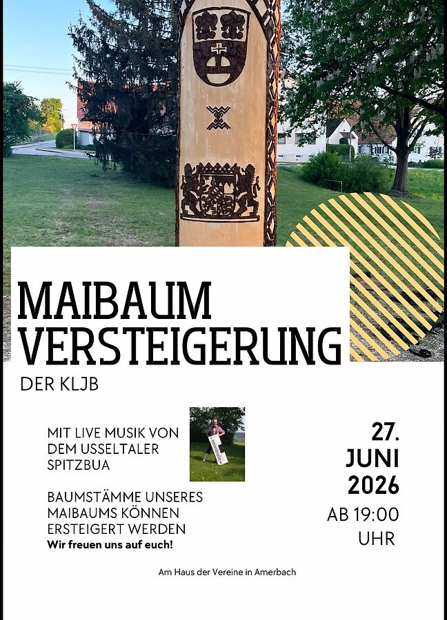 Am Samstag, den 27. Juni ab 19.00 Uhr findet eine Maibaumversteigerung der KLJB Amerbach mit live Musik von dem Usseltaler Spitzbua statt. Es können Baumstämme des Amerbacher Maibaums ersteigert werden. Die Veranstaltung findet am Haus der Vereine in Amerbach statt.